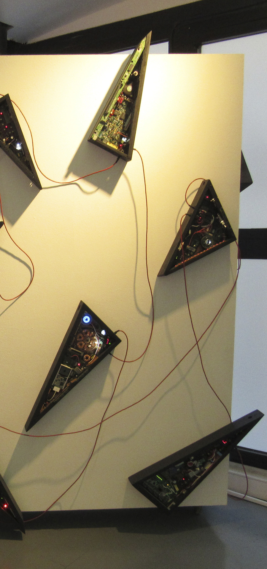 Esta obra instalativa, se compone de 18 piezas escultóricas individuales, donde cada una tiene forma geométrica triangular. Cada pieza de este nuevo sistema que presento aquí, tiene también comportamiento autónomo en cada unidad, pero a diferencia de su antecesor "COLONIA", los comportamientos son ampliamente variados: hay numerosa iluminación leds, hay movimiento de dispositivos motorizados, hay sonidos, mecanismos varios y hay también numerosas partes y piezas de componentes electrónicos y eléctricos diversos. En definitiva, toda una 'sociedad' en actividad dentro de cada uno de estas esculturas triangulares.