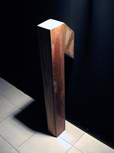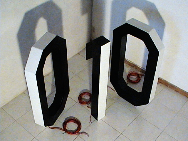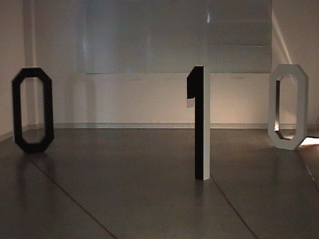 Dos “ceros” y un “uno” forman el total de esta escultura sonora la cual reproduce independientemente desde cada numero y desde su interior, 3 textos leídos a modo de voz en off y registrados digitalmente para luego ser reproducidos en forma de loop continuo.