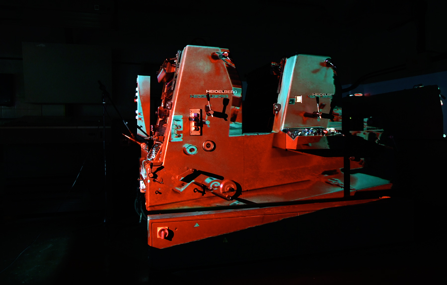 Emplazada en uno de los talleres principales de la Fundación Gutenberg, (Fundación dedicada a impartir educación superior en relación a los oficios gráficos) fue realizada esta intervención que dialoga directamente con la maquinaria que ocupa un lugar central en el mismo. Una máquina Heidelberg especifica para realizar impresiones Offset fue intervenida con una proyección de video que reproduce su propio reflejo a medida que funciona indefinidamente en su proceso de trabajo. "Intervención Maquínica" indaga acerca de las otras voces (los otros sonidos) que la maquinaria es capaz de hacernos escuchar, estas voces, desde un lugar conceptual, son el discurso de nuestra sociedad tecnologizada. Literalmente aquí, en esta obra, el sonido de la propia máquina, (en su funcionar diario) permite vislumbrar una imagen sobreimpresa de ella misma que es su otro "yo" mecánico....