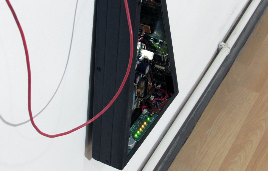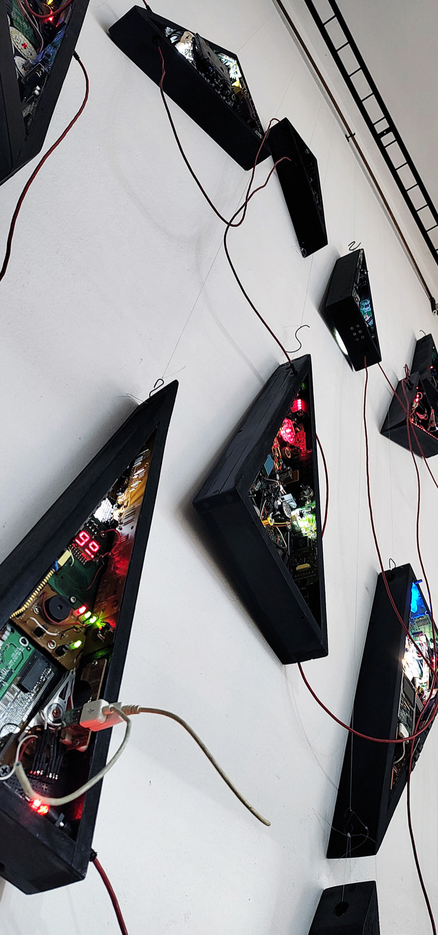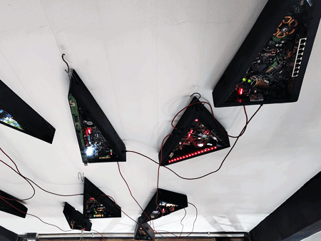Esta obra instalativa, se compone de 18 piezas escultóricas individuales, donde cada una tiene forma geométrica triangular. Cada pieza de este nuevo sistema que presento aquí, tiene también comportamiento autónomo en cada unidad, pero a diferencia de su antecesor "COLONIA", los comportamientos son ampliamente variados: hay numerosa iluminación leds, hay movimiento de dispositivos motorizados, hay sonidos, mecanismos varios y hay también numerosas partes y piezas de componentes electrónicos y eléctricos diversos. En definitiva, toda una 'sociedad' en actividad dentro de cada uno de estas esculturas triangulares.